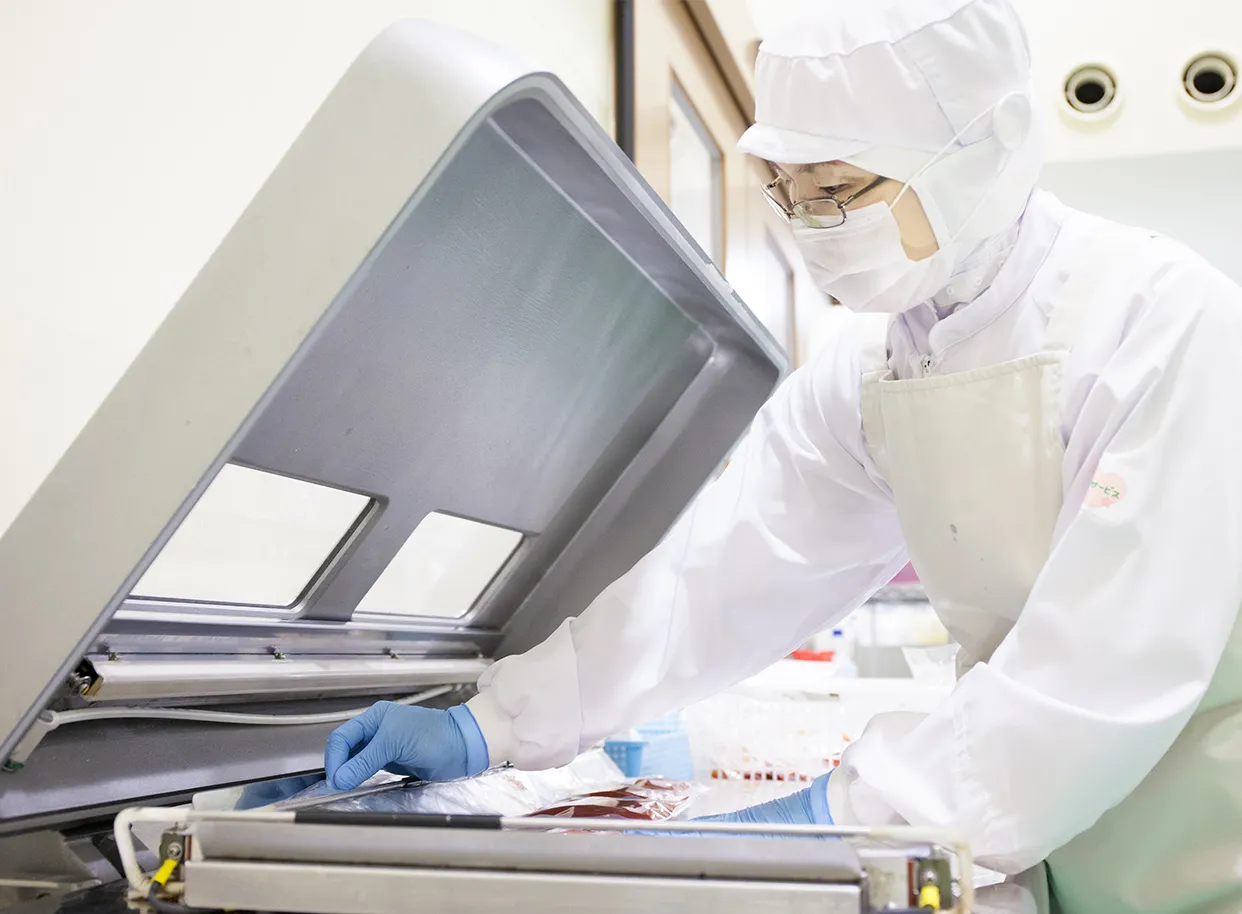 調理後の食材を正確な分量でパック詰し、真空処理します。
